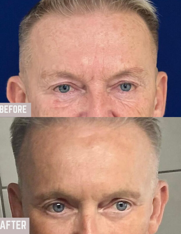 Εξισορροπώντας εκ νέου τους μύες του μεσοφρύου (τον πυραμοειδή και τους επισκήνιους μύες) που προκαλούν το συνοφρύωμα και πιέζουν τα φρύδια προς τα κάτω, ο Δρ. Αναστασάτος μετέτρεψε το σοβαρό, αυστηρό και συνοφρυωμένο βλέμμα αυτού του ασθενούς σε μια πιο ελκυστική, νεανική, ζωντανή, θετική και γοητευτική εμφάνιση. Η έκφραση του προσώπου και η αύρα του έγιναν λαμπερές και φωτεινές.