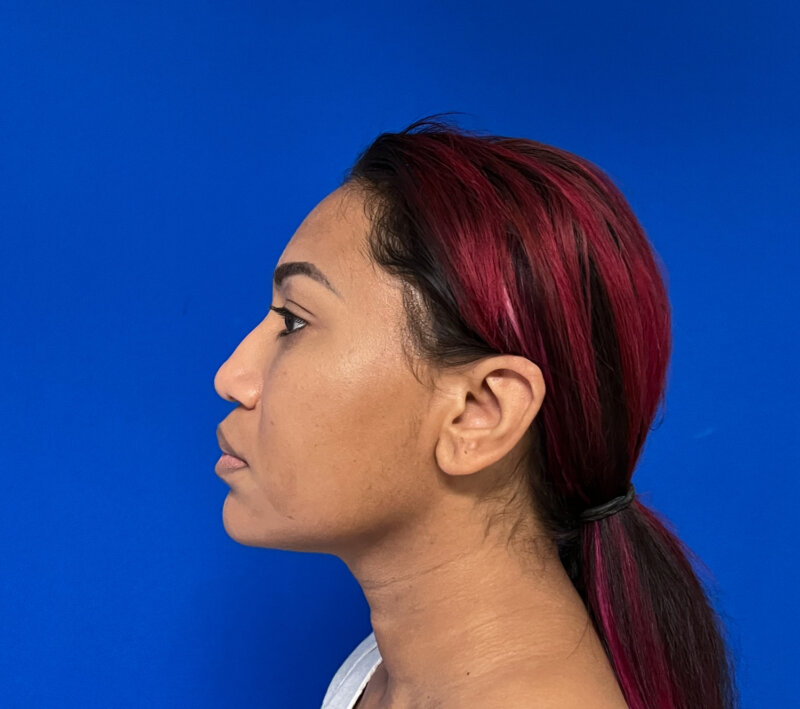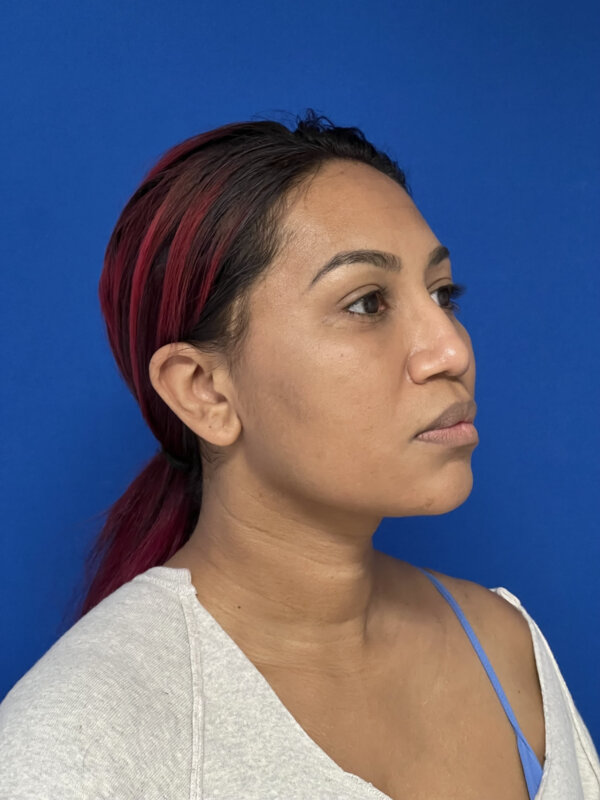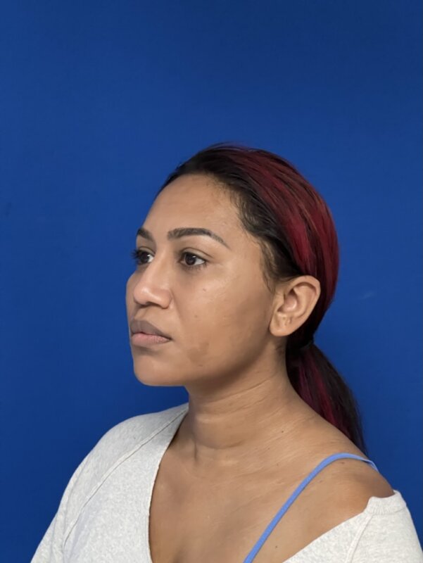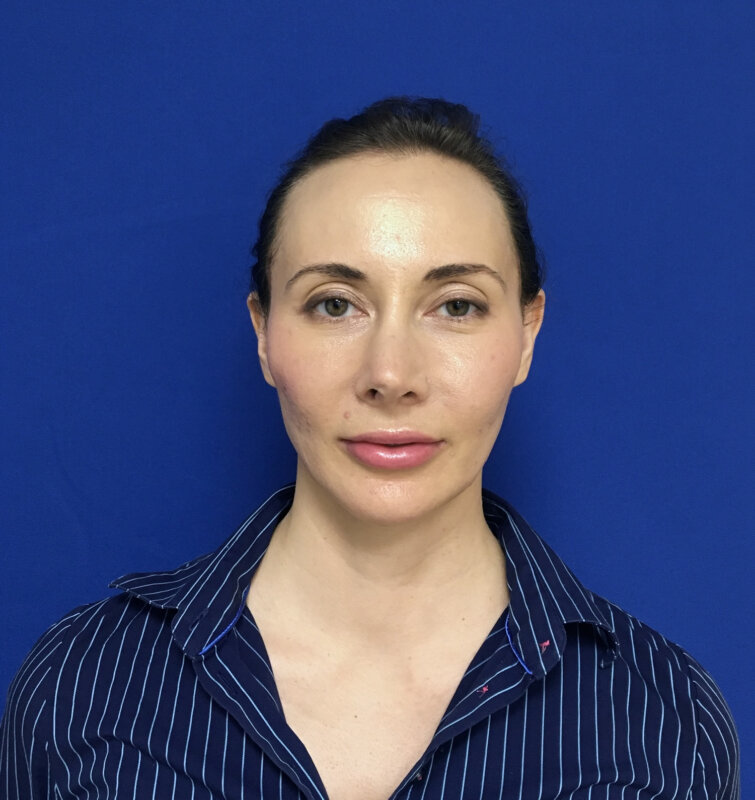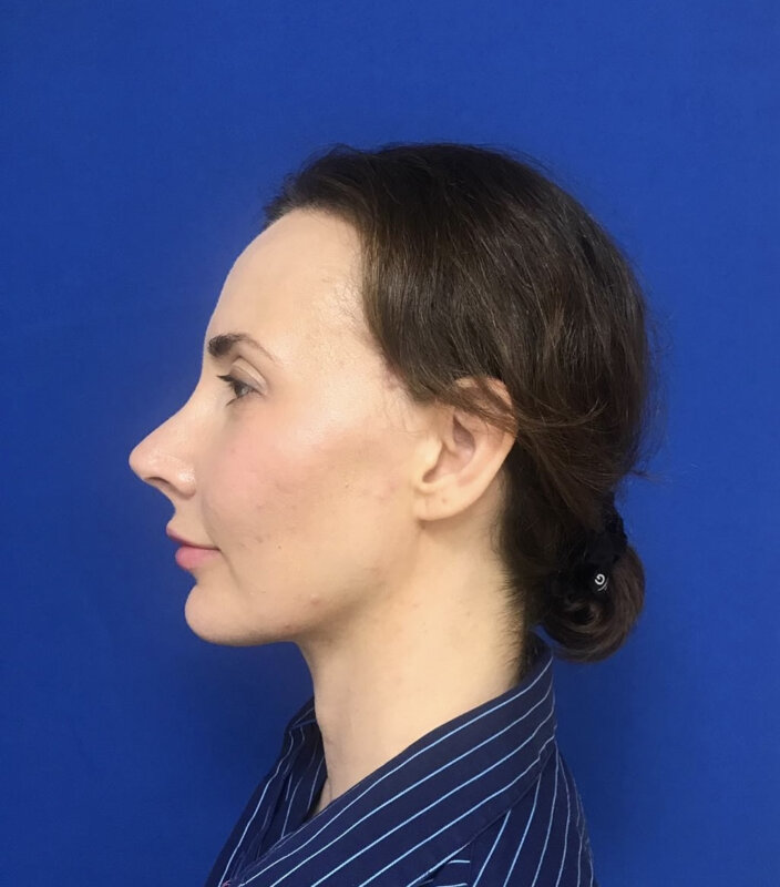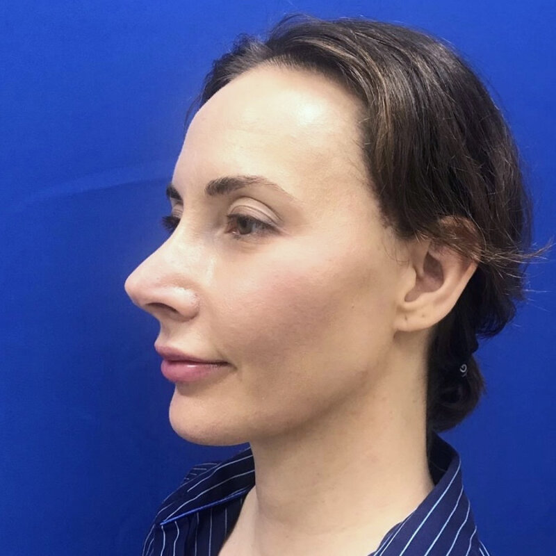 Πλέον έχει ανυψωμένα και πιο έντονα ζυγωματικά, οι γωνίες του στόματος ανυψώθηκαν στη φυσική τους θέση και βελτιώθηκε η χαλάρωση στο κάτω μέρος των παρειών (jowls). Επιπλέον, υποβλήθηκε σε μεταφορά λίπους στις ακόλουθες περιοχές: κάτω από τα μάτια, στα χείλη, στο πηγούνι και στη γραμμή της γνάθου. Παρατηρήστε πώς ολόκληρο το πρόσωπό της έχει μεταμορφωθεί και δείχνει νεότερο, ανανεωμένο, πιο αρμονικό και με καλύτερο περίγραμμα.