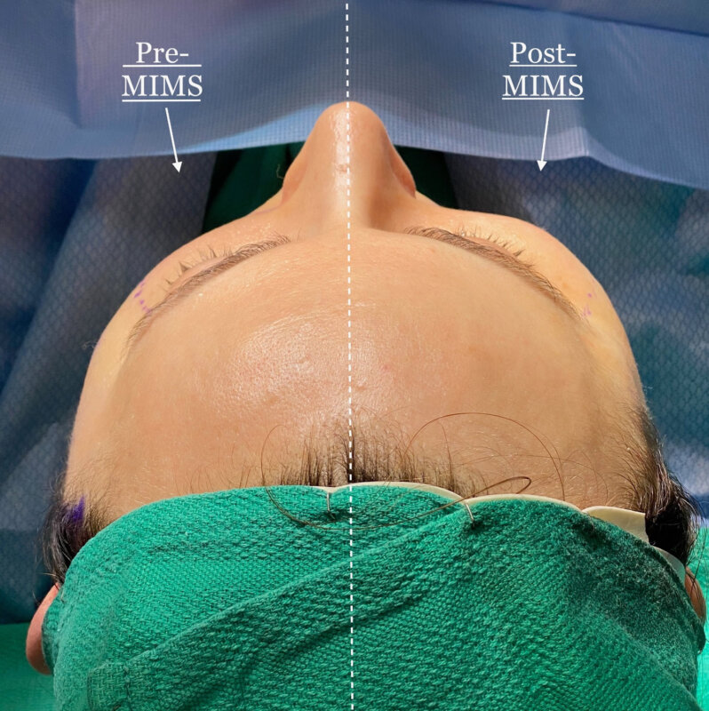 Είχε επίσης επιπέδωση του μέσου προσώπου και απώλεια της προβολής και του όγκου των ζυγωματικών. Ήταν σημαντικό για αυτόν να αποκαταστήσει τον όγκο και την προβολή των ζυγωματικών και να φαίνεται πιο αρρενωπός και ελκυστικός. Είχε έντονη χαλάρωση στο κάτω μέρος των παρειών (jowls) που επηρέαζε τη γραμμή της γνάθου του. Η βελτίωση της χαλάρωσης και της γραμμής της γνάθου του ήταν η κύρια προτεραιότητά του. Ο Δρ. Αναστασάτος αρχικά πρότεινε ένα ανοιχτό facelift. Ο κύριος λόγος γι' αυτό ήταν η αφαίρεση της περίσσειας χαλαρού δέρματος που είχε ο ασθενής. Ωστόσο, ο ασθενής δεν ήθελε ένα ανοιχτό facelift επειδή φοβόταν τις ουλές και την επεμβατική φύση του facelift, καθώς και τον παρατεταμένο χρόνο ανάρρωσης. Ο Δρ. Αναστασάτος πραγματοποίησε τη χαρακτηριστική του επέμβαση, η οποία είναι η ελάχιστα επεμβατική ανάρτηση του μέσου προσώπου (MIM) ή το facelift «χωρίς ουλές». Ολόκληρη η επέμβαση γίνεται μέσω μιας μικρής τομής που έχει μήκος μόνο περίπου 1 ½ ίντσες ή περίπου 3,5 εκατοστά και βρίσκεται στο τριχωτό τμήμα του κροτάφου ή στη γραμμή των μαλλιών στον κρόταφο, όπως σε αυτόν τον ασθενή. Θεωρήστε το ως ένα «κλειστό» facelift, το οποίο ανυψώνει το μέσο πρόσωπο, βελτιώνει τη χαλάρωση και τη γραμμή της γνάθου και αποκαθιστά την προβολή των ζυγωματικών.